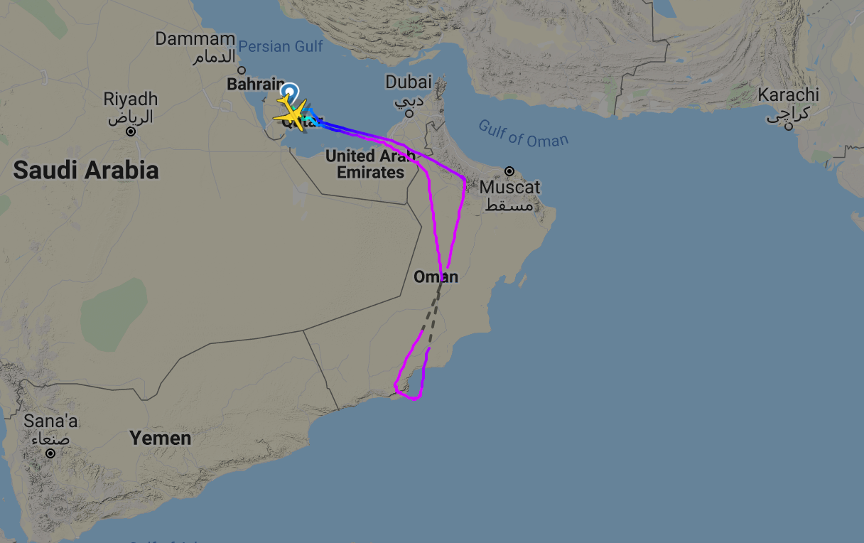 Data from tracking website FlightRadar24 shows the plane taking off from Doha, flying across the United Arab Emirates and down the length of Oman before turning back.