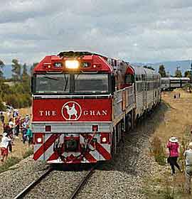 The civilised way to cross the Nullarbor Plain is by the Indian Pacific (0870 751 5000; www.gsr.com.au), which covers the 4,352km between Sydney and Perth in 64 hours. The Ghan (0870 751 5000; www.gsr.com.au) runs on a line fully opened only last year from Adelaide via Alice Springs and Katherine to the coast at Darwin, a 2,979km north-south crossing of the continent. Though not on a par with other luxury trains, Gold coaches offer ensuite showers and toilets and food, plus modern Australian cuisine.