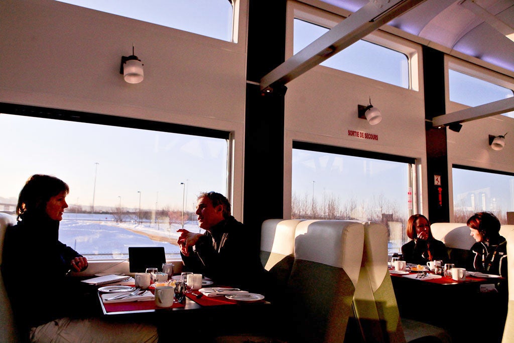 After one and three-quarter hours, we all piled out of the train, skiwear on and equipment to hand, and boarded the gondola for a day's skiing, having eaten a fancy cooked breakfast onboard. Six hours later – pleasantly exhausted by the choppy, fresh-snow conditions – we were back for a considerably fancier meal on the return journey, with darkness falling outside and subtle coloured lights conjuring a nightlife atmosphere on board.