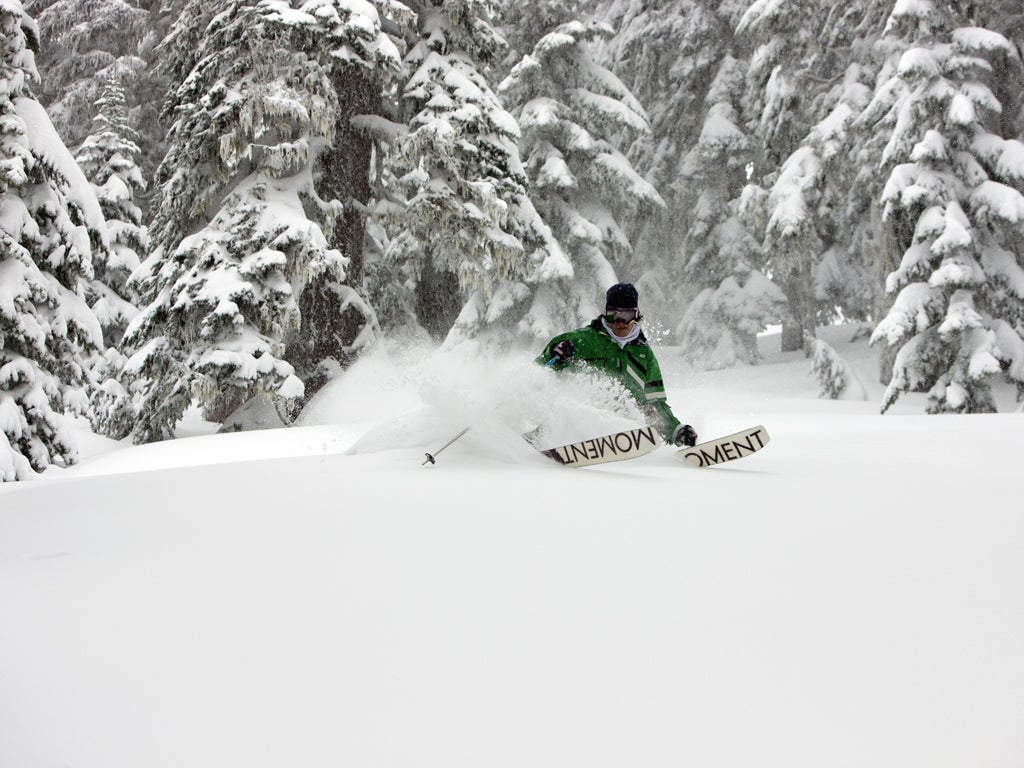 The next morning, a blizzard rips through the car park at Sunriver, deterring the President's Weekend crowds from heading up to the hill. That was their miscalculation: the woods that circle the base of the mountain have excellent visibility and two feet of fresh powder do the rest.