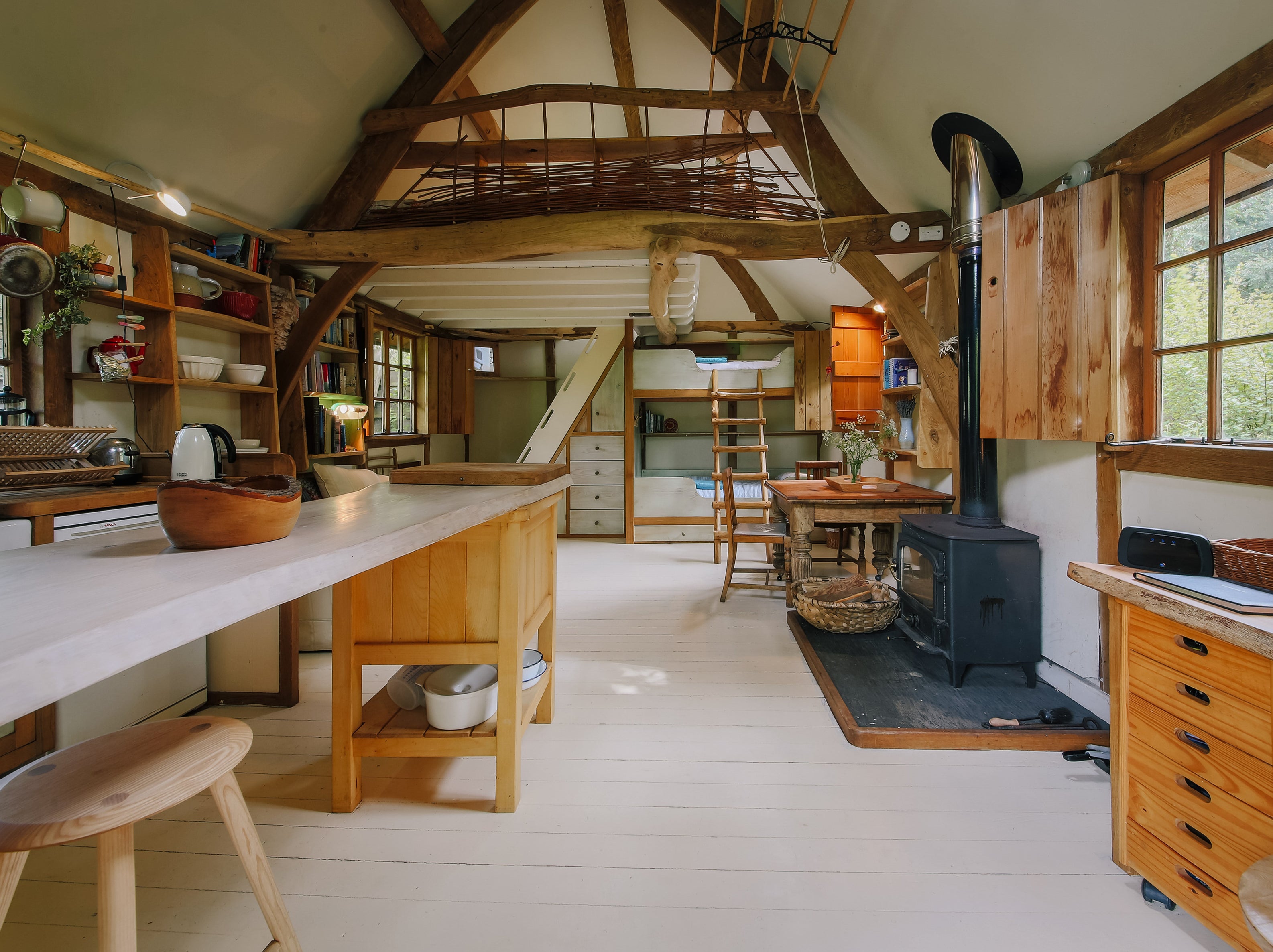 Once an artist’s studio belonging to the printmaker Hugh Stoneman, this timber-framed pole house is all about light, space and woodland views. Downstairs, there’s an open-plan living and kitchen space, wooden-floored and filled with artworks, while upstairs is a small mezzanine bedroom, complete with a skylight for stargazing. The building’s footprint is small, but it feels much roomier thanks to the floor-to-ceiling windows, and the wraparound wooden deck that looks out over six acres of private land.