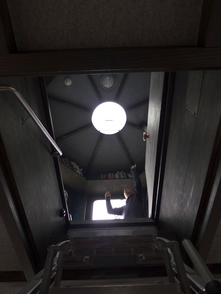 It's not really a boat at all. Le Roi des Belges was fabricated in three sections in a Brighton yard by an exhibition contractor and craned into place. Still, the illusion is impressive. You pass through a door into a saloon with heads on the left and galley on the right, secluded by concertina screens. This saloon is partitioned at its median and beyond it you find a double bed, itself stowable, facing the prow. A drop-down ladder allows access to a bridge, intended here as study space. And from this study another ladder leads to a hinged Perspex bubble. Above that, an openwork structure hosting at its summit three humming WTGs (wind turbine generators) that provide most of the power A Room for London needs.
