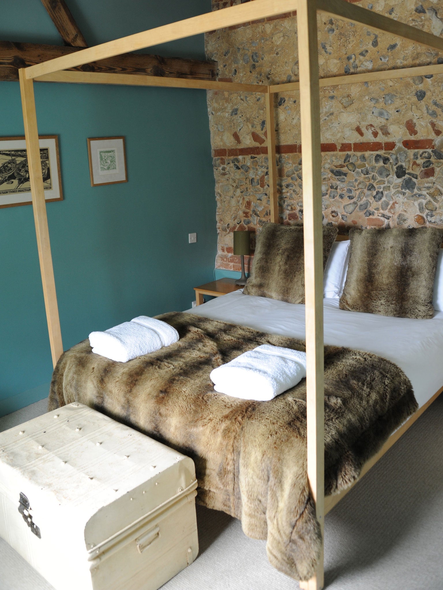 Little Barsham, where I stayed, is the smallest. Exposed flint walls bring a rustic feel to the high-ceilinged open-plan sitting/dining room, with French doors framing views of fields and All Saints parish church beyond. Big deep sofas face the fireplace and flat-screen TV. Both en-suite bedrooms are in soothing shades of duck-egg blue, one with a four-poster bed; the other with twin beds that can be made into one.