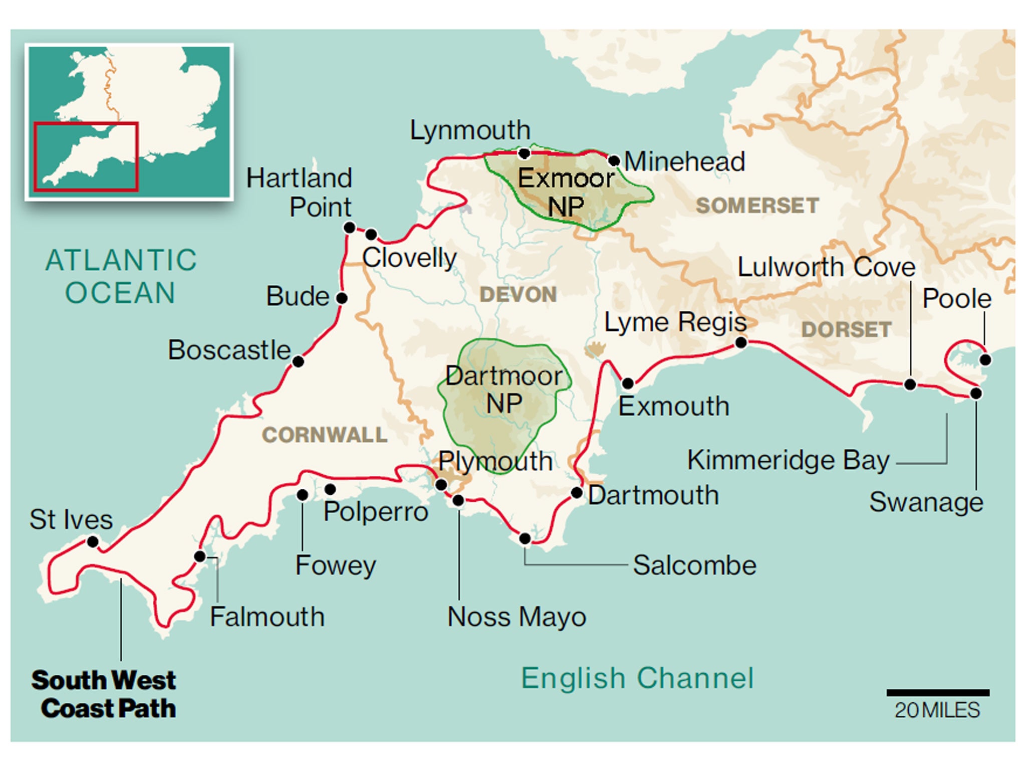 So ended my first day of walking the South West Coast Path (SWCP), the 1,014km National Trail – the longest of 15 in England and Wales – that has traced the rugged edges from Minehead in Somerset to Poole in Dorset since opening in 1978. From next week, the path is hosting a range of sponsored hikes to celebrate the 40th anniversary of the SWCP Association, the independent voluntary organisation that campaigns to improve and safeguard the path. About 70 per cent of the trail runs through national parks or protected areas, encompassing cliffs, coves, dunes, beaches, valleys, lighthouses, tumbling fishing villages and arty seaside towns.