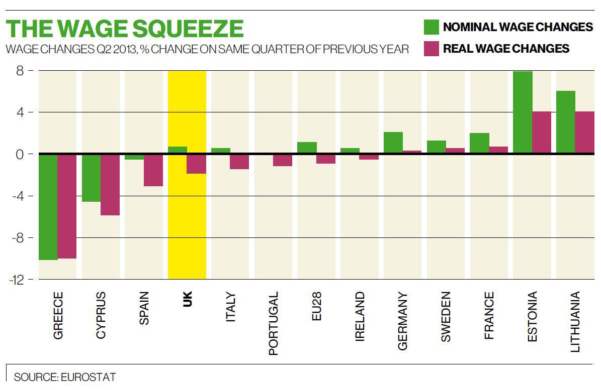 Workers in the UK saw wages rise by only 0.6 per cent, which means that their real wages fell 1.9 per cent. Real wage growth in the UK ranks 23rd out of the 28 EU countries, and well below Germany, France and Italy.