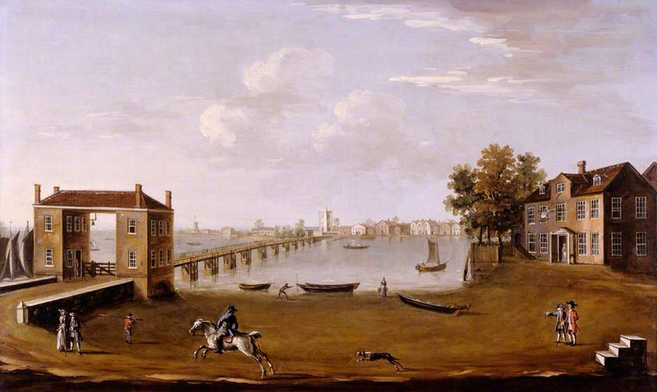 1. I give you another of Sir William Davenant’s wonderful views of old London. This is Putney bridge and the village of Putney as seen from Fulham village c.1750.