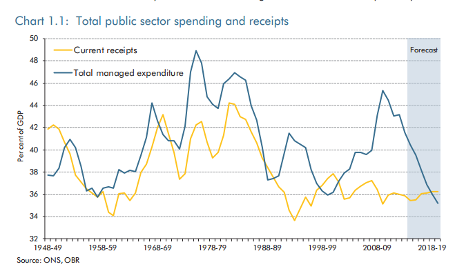 5. Returning to Ed Miliband’s speech, here is the chart in last week’s Office for Budget Responsibility report on the Autumn Statement that gave rise to the 35 per cent figure (actually 35.2 per cent) for public spending as a share of national income, which is supposed to be a scary return to the levels of the 1930s – and which gave Miliband his chance to attack George Osborne as the top-hatted, face-grinding, mill-owners’ friend. As you can see, however, the 35.2 per cent, which no one expects Osborne to achieve in 2019/20, is only barely below the level at which mass destitution prevailed in the nation in 2000/01, under the oppressive Tory chancellor, Gordon Brown: