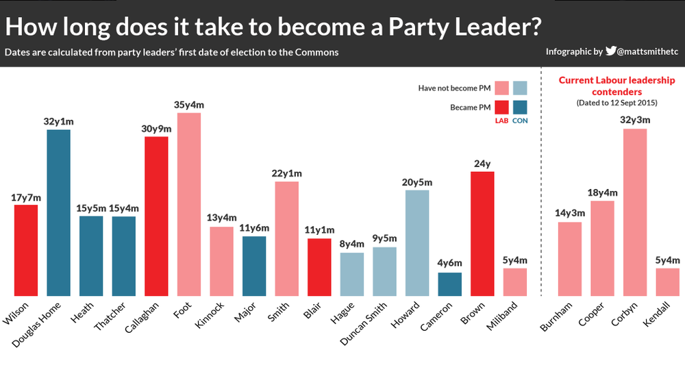 1. How long were party leaders MPs before they got the top job? Fabulous chart from Matthew Smith. Liz Kendall has already been in the House of Commons for longer than David Cameron was before he became leader.