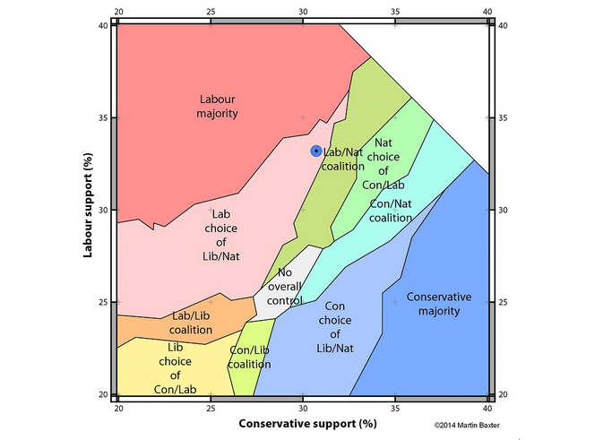 1. Fabulously complex map of the options in a hung parliament, by Martin Baxter of Electoral Calculus. It plots likely numbers of MPs for the Conservative and Labour percentage shares of the vote. Their current averages in the opinion polls are 31 per cent and 33 per cent, the point shown as a large blue dot. This is in the pink zone, in which Labour would need either the Lib Dems or the SNP to make a majority in the House of Commons.