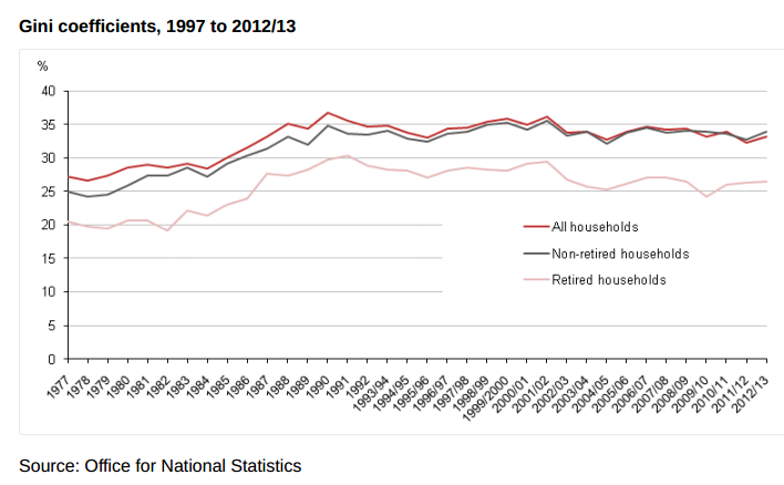 The most recent official figures are from the independent Office for National Statistics, a series called “The Effects of Taxes and Benefits on Household Income, 2012/13”. The graph below is taken from page 19 and shows the Gini coefficient for disposable income since 1977. The Gini coefficient is a statistical measure of how unequally something is distributed, higher values showing greater inequality.