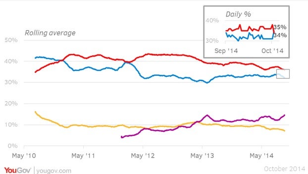 But the trend in the graph above shows that the Tory-Labour gap has been tightening for some time.