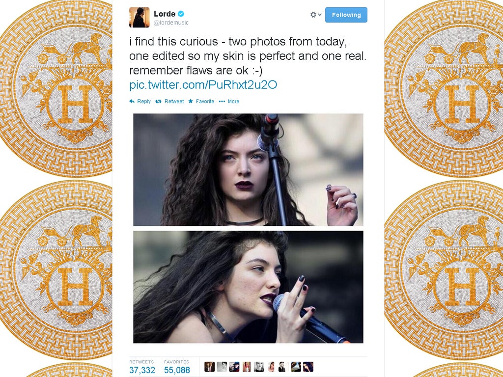 Make-up: wear it or don't wear it, it's something some of us struggle with more than others. And many are vociferous in their battle against images of Photoshopped perfection. Two-time Grammy winner Lorde shared two thought-provoking images of herself on stage this weekend in Santiago on Twitter – one showing evidence of her very normal, acne-pocked, 17-year-old skin; the other altered to hide it. 'I find this curious – two photos from today, one edited so my skin is perfect and one real. Remember flaws are OK,' she told her 1.3m followers. Last month, she also posted a bare-faced snap of herself with the caption: 'In bed in Paris with my acne cream on'.