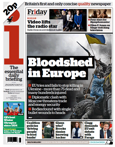We lead today’s i with a story from our foreign bureaux: the killings in Ukraine, as a Moscow-backed President tries to crush a mass uprising by citizens who want closer ties with us in the EU and are disgusted by rampant corruption. As the death toll passes 70, with many hundreds wounded, Europe’s seventh most populous country wobbles on the precipice of much wider conflict. EU countries are dependent on imported energy and on Ukraine as the gateway for Russian gas.