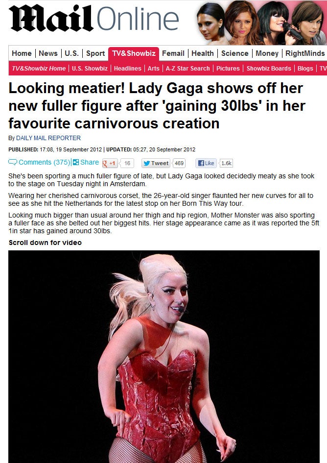 What really bothers me isn't just the initial onslaught of weight-gain articles themselves (those with disgusting captions describing every inch of Gaga's flesh as though she is no more than a piece of meat hanging in the butchers), although they do, to the point of me actually feeling so enraged that I can physically feel the fury rising in my chest. It is the less obvious articles that follow that we should be most worried about. The first ones are all shock and speculation, but those that follow, and the language used in them send messages that are potentially far more dangerous.