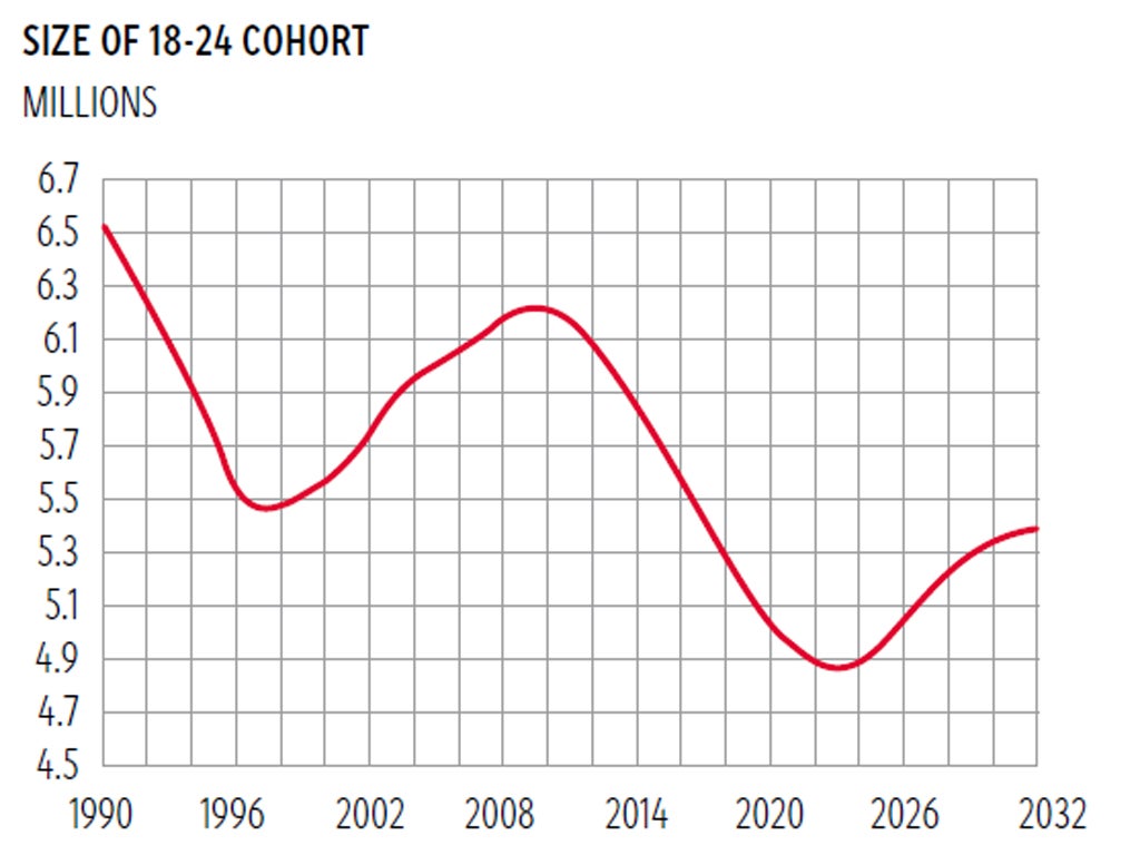 The second chart shows one of the reasons for this is that the number of young people was especially large when recession hit. The chart reports the number of 18-24 year olds based on data by single year of age. So we know the number of 18-24 year olds today but we can also calculate the number in earlier years, so in 2008 I report the number of 24-30-year-olds today. In 2032 I calculate the number as the sum of all the 0-6 year olds. These numbers are correct assuming no net migration of course. They are not projections but simply counts of the numbers based on the current size of the cohorts. They show that the number of 18-24 year olds in 2008, at the onset of recession, was higher than it had been since 1990 and higher than it will be for at least another 20 years or so, all other things held constant. A big part of the reason that youth unemployment started to rise during the period 2000-2008 was simply that the size of the cohort expanded each year.